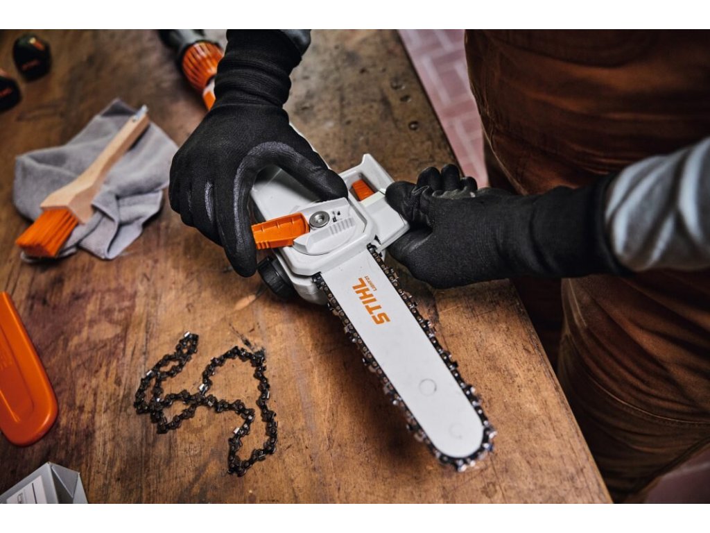 Napínací páka integrovaná do háku na větve zajišťuje správné napnutí řetězu, a tím usnadňuje rychlou montáž řezného nástroje bez použití nářadí po čištění nebo výměně řetězu. Napínací páka a všechny ostatní ovládací prvky HTA 30 jsou snadno přístupné i v pracovních rukavicích.