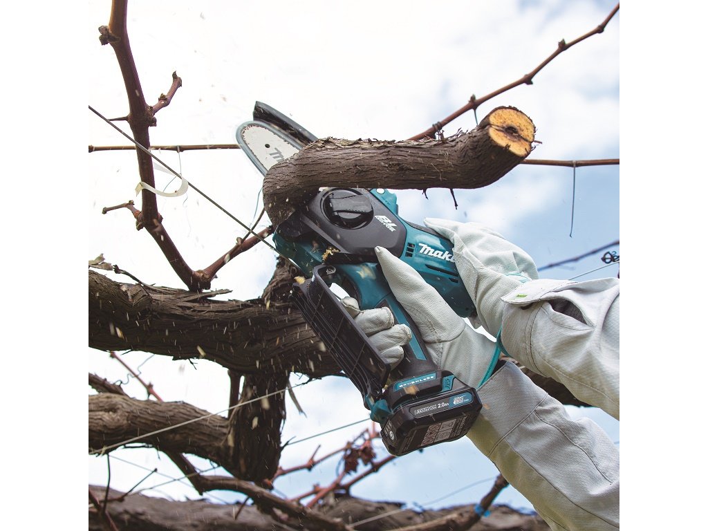 - Lehká a kompaktní prořezávací pila s lištou 100mm fungující na akumulátory Li-ion 12V