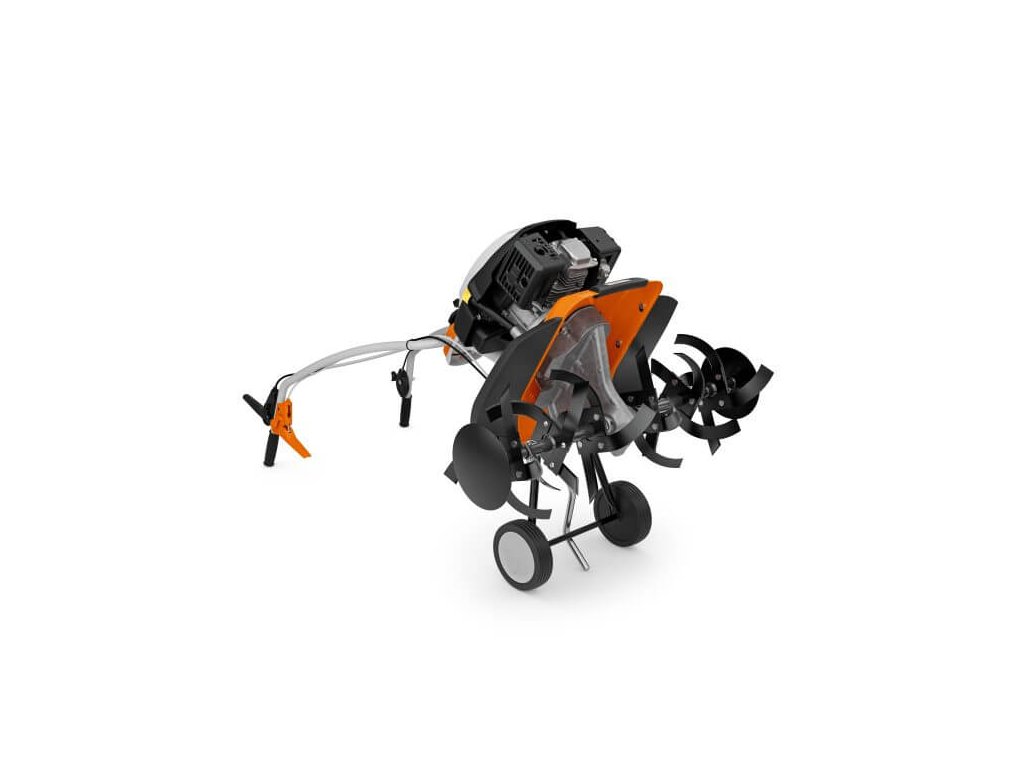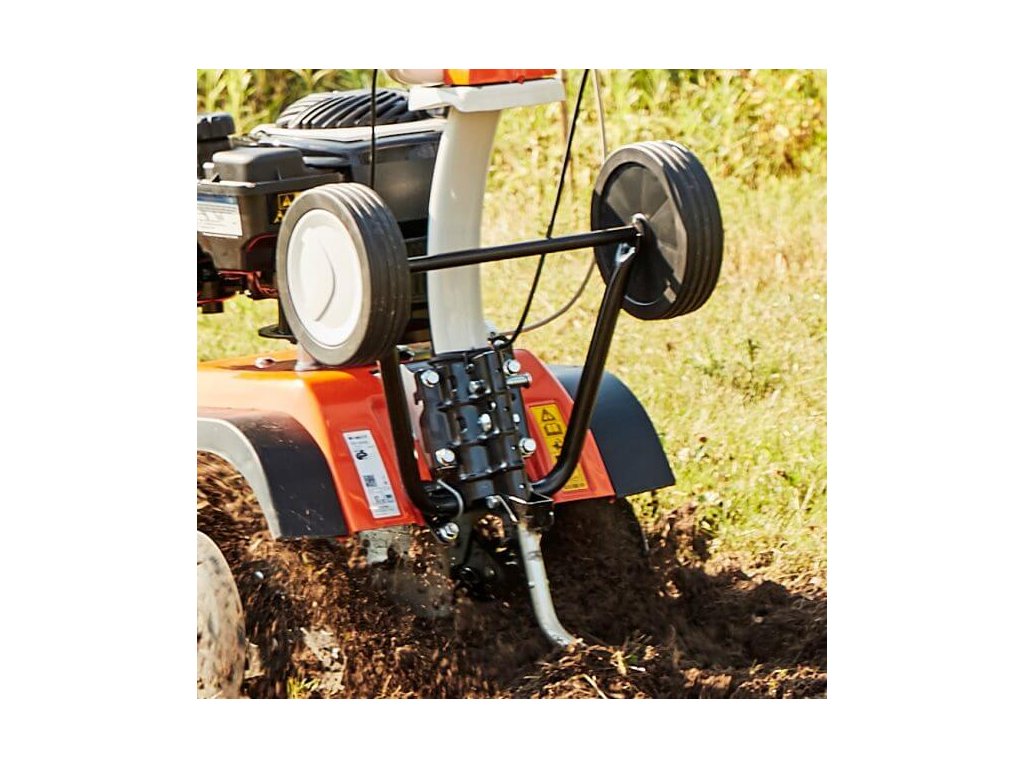 - Snadná manipulace: Díky zpětnému chodu a sklopným přepravním kolům je s kypřičem snadné manévrovat a přemisťovat ho.